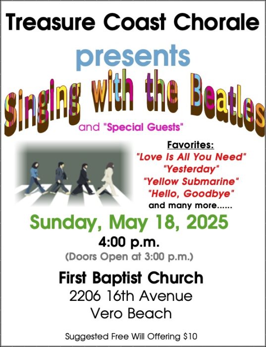 The British Invasion is here again as the Treasure Coast Chorale presents “Singing with the Greats – The Beatles” at 4:00 on May 18 at the First Baptist Church, Vero Beach.