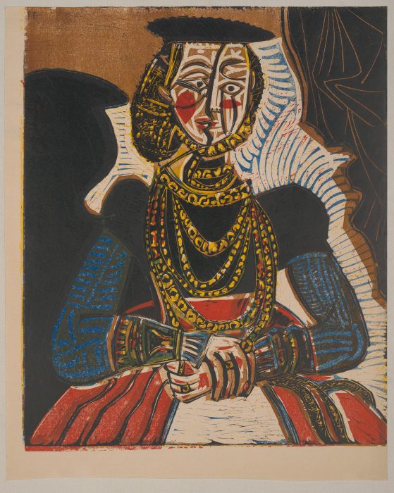 Three prints—Portrait of a Young Woman after Cranach the Younger II, Pique II, and Bacchanal with Kid Goat and Onlooker—along with their various proofs, offer insight into Picasso’s distinctive printmaking techniques and his groundbreaking contributions to the medium. From collaborative notations, explorations of color, repurposing of poster paper, and reduction printing techniques, Picasso reinvented yet another art form–the linocut.