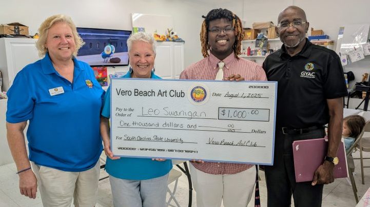 The Vero Beach Art Club, a nonprofit, had money left in the scholarship fund…. a student at Gifford Youth Achievement Center, Leo Swanigan, started volunteering to help with Summer Camp….the VBAC staff found out he was starting at South Carolina State University in a couple of weeks….The Board decided to present him with a surprise $1000 scholarship on his last day. Leo is taking Studio Art as his major so that he can do graphics or fine art and wants to work in animation. For more information about the Vero Beach Art Club: