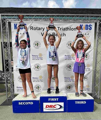 This one-of-a-kind community event was created to improve the health and welfare of children in Indian River County. Hosted by the Rotary Club of Vero Beach, Vero’s first Rotary Club, in partnership with Indian River County and Treasure Coast Community Health, the event now accommodates 400 children – and it sells out every year. It is always held on the first Saturday of every December and takes place at the Victor Hart Sr. Community Enhancement Complex in Vero Beach. The Junior children between 6 – 9 years complete one-half the distance of the Senior children between 10-13 years. After the Juniors swim three lengths at the Gifford Aquatic Center, they pick up their bikes in the Transition Area and Bike along 43rd Avenue, which is closed to vehicular traffic. Then they complete the race by running one half mile to the Finish Line, where they will proudly receive a beautiful Olympic-style Finisher Medal.