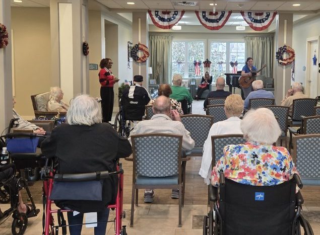 The ceremonies included singing patriotic songs led by VNA Music Therapists. VNA’s Community Liaison, Jessica Nettles, also gave a poignant speech honoring the Veterans and recognizing their service that included a pinning ceremony. The highlight of the celebrations was a “We Honor Veterans Wall of Heroes,” which featured photos of all the Veterans on a dedicated wall in a few of the assisted living facilities.