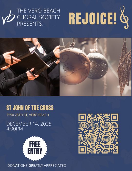 For Christians around the globe, Christmas is a time of celebration and rejoicing. Music lovers can immerse themselves in the sound of the season with a performance of the Vero Beach Choral Society during Rejoice! on Sunday, December 14 at 4:00 PM at Saint John of the Cross Catholic Church, 7550 26th Street in Vero Beach.