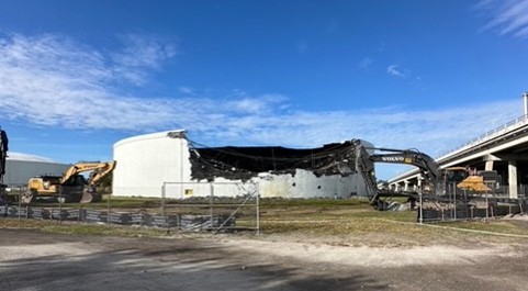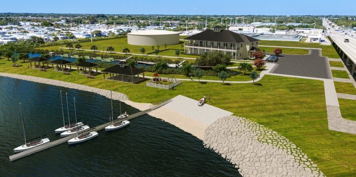 Work began on December 1 on the Pat Harris Community Sailing Center and the Charlie and Chris Pope Marine Recreational Park with the demolition of a large water tank at the Vero Beach Wastewater Treatment Plant. This is the first step in the construction process to build a 10,000 square foot sailing center surrounded by a 3-acre park with boat ramps, a pier, and pavilions for educational and recreational use.