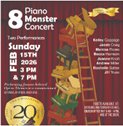 Christ by the Sea is hosting Eight Piano Monster Concert on Feb. 15 at 3:00 & 7:00 p.m. Pianists Kelley Coppage, Jacob Craig, Marcos Flores, Becca Harrison, Joanne Knott, Andrew Miller, Rochelle Sallee, and Jill Truax will perform together on 8 pianos with their 16 hands and 80 fingers flying and dancing all over 704 ivory keys! Ticketed.