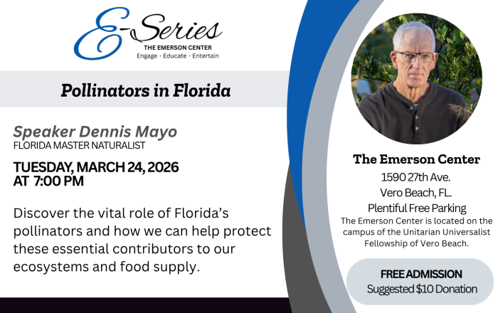 The Emerson Center welcomes Dennis Mayo, Florida Master Naturalist, for an engaging E-Series lecture, Pollinators in Florida: Nature’s Essential Workers, on Tuesday, March 24, 2026, at 7:00 p.m. Mayo will explore the vital role of pollinators—from bees and butterflies to bats and birds—in maintaining Florida’s ecosystems and food supply, and share practical ways the public can help protect them.