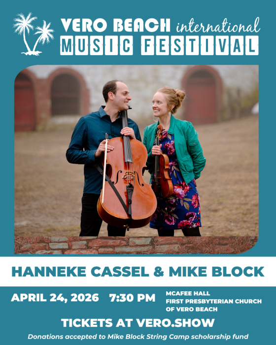 With six solo albums to her credit, fiddle champion Cassel will headline the concert, with Block performing a variety of numbers alongside her in duets. Tickets to the Vero Beach International Music Festival are $25 and can be pre-ordered online at VeroBeachInternationalMusicFestival.com or purchased at the door. Donations will also be accepted at the concert for the Mike Block String Camp Scholarship Fund. For more information, call 216-965-7593.